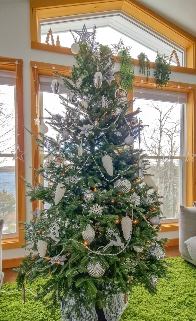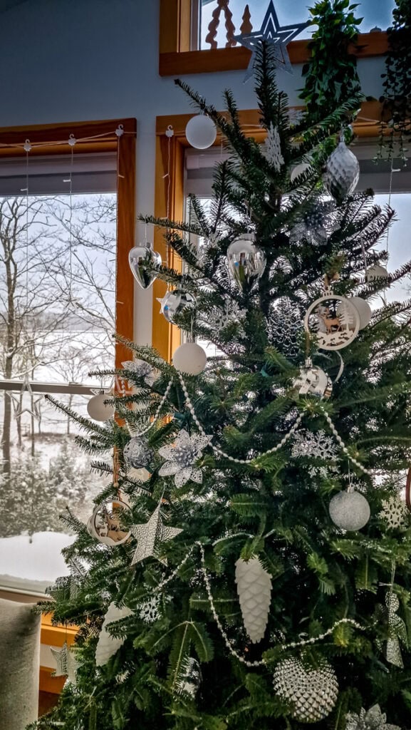 Aber man glaubt es kaum, rechtzeitig zu Weihnachten schneit es kräftig und romantische weiße Weihnachten im Haus am See sind gesichert! Diesmal möchten wir einen richtigen Weihnachtsbaum haben, der nicht bereits nach 3 Tagen nadelt … der vom letzten Jahr, geschlagen im eigenen Wald, war zwar gut fürs Ego, aber ein „Christbaum“ war es nicht! In Facebook poppt eine Nachricht auf, es gibt eine Weihnachtsbaumplantage ganz in der Nähe, wow. Da müssen wir unbedingt hin! So wie alles hier, ist es nicht wirklich professionell sondern sehr privat und ein bisschen hemdsärmelig ;-). Aber der Farmer bietet tatsächlich ganz wunderschöne frisch geschlagene Bäume an … extrem gleichmäßig und dicht gewachsen. Ich wage zu behaupten, in den letzten 30 Jahren hatten wir noch nie so einen schönen Christbaum stehen. Beim Christbaumschmuck wird auch noch etwas aufgerüstet … und an Heilig Abend freuen wir uns über unseren echt stylischen Weihnachtsbaum in der guten Stube.